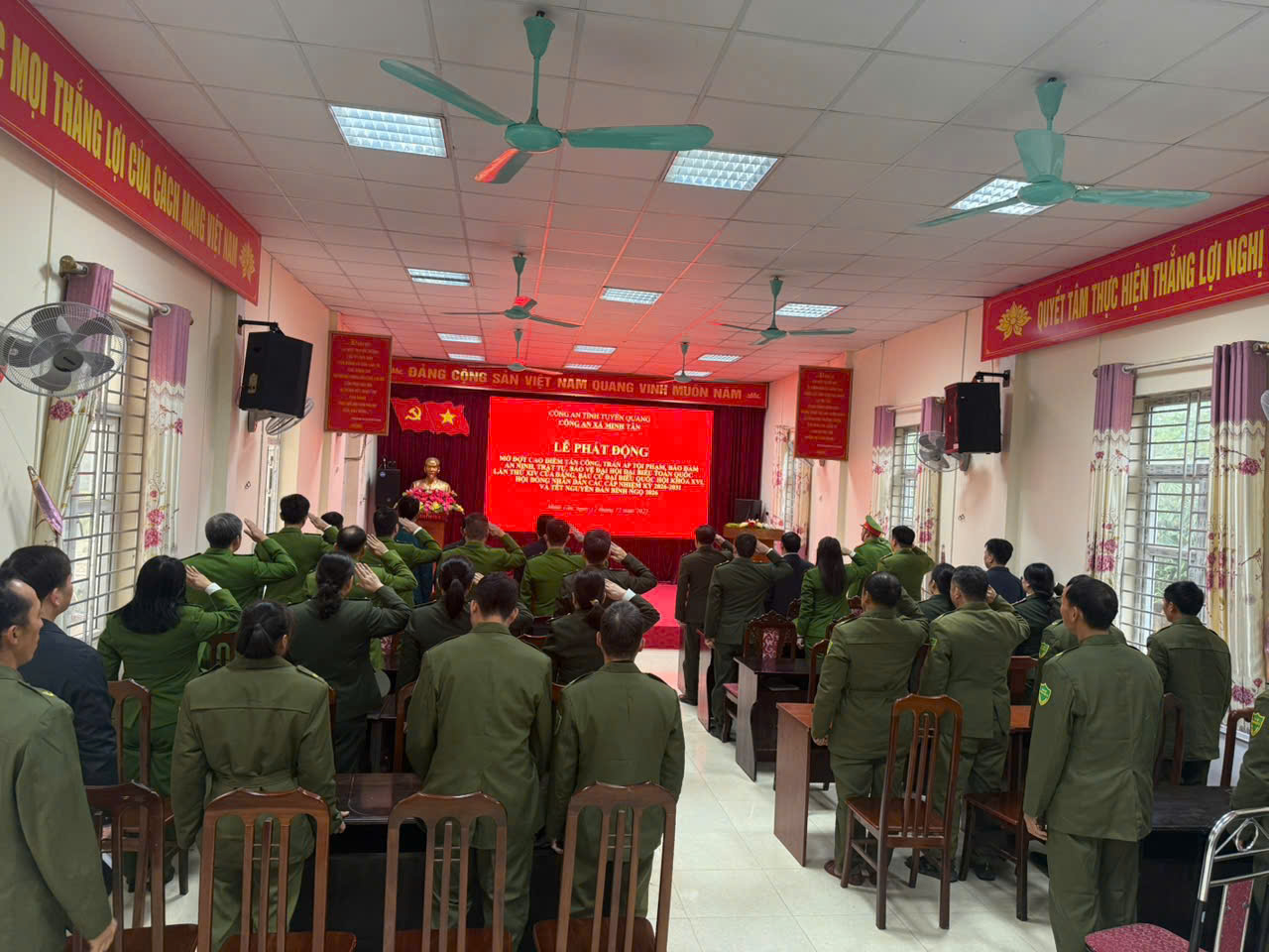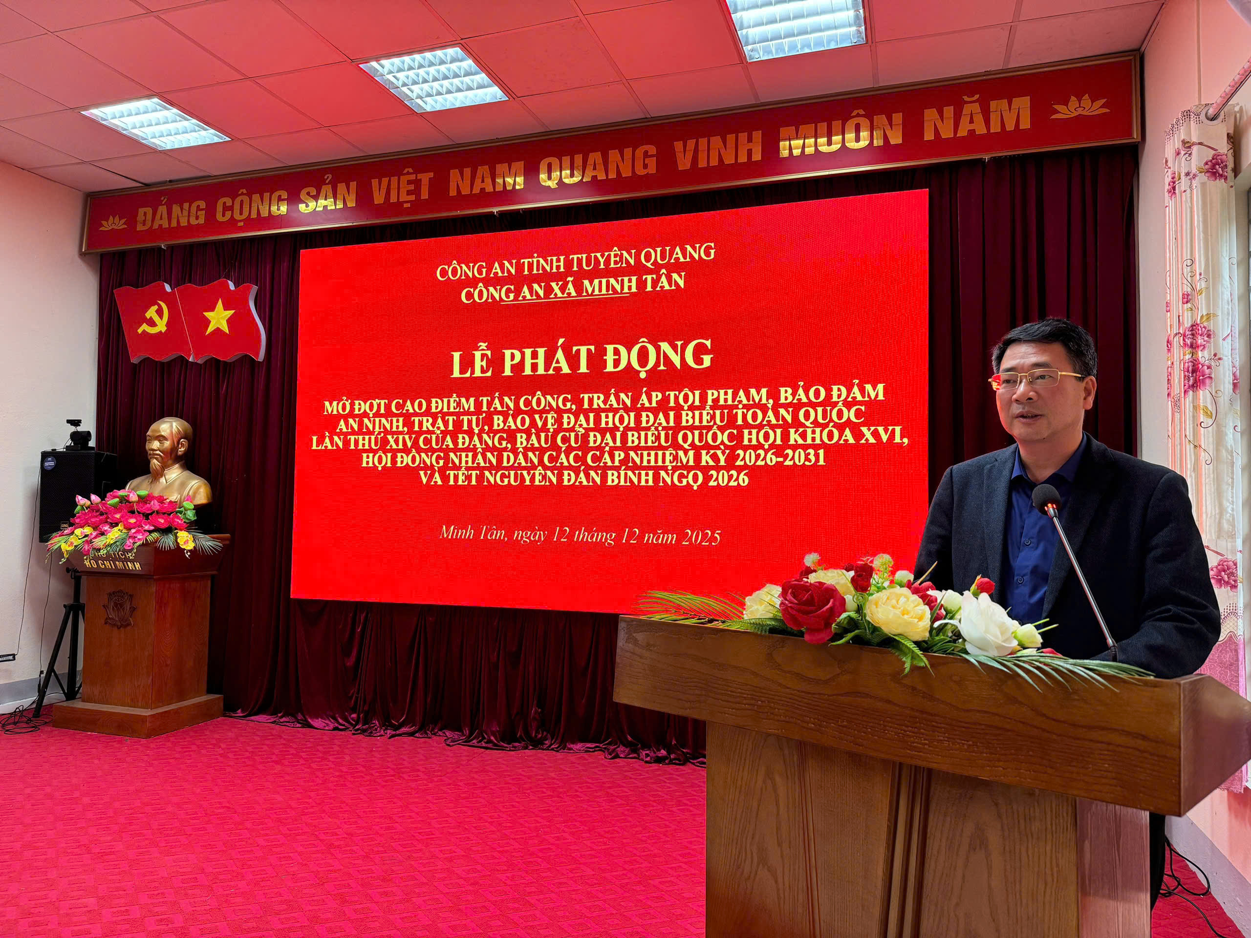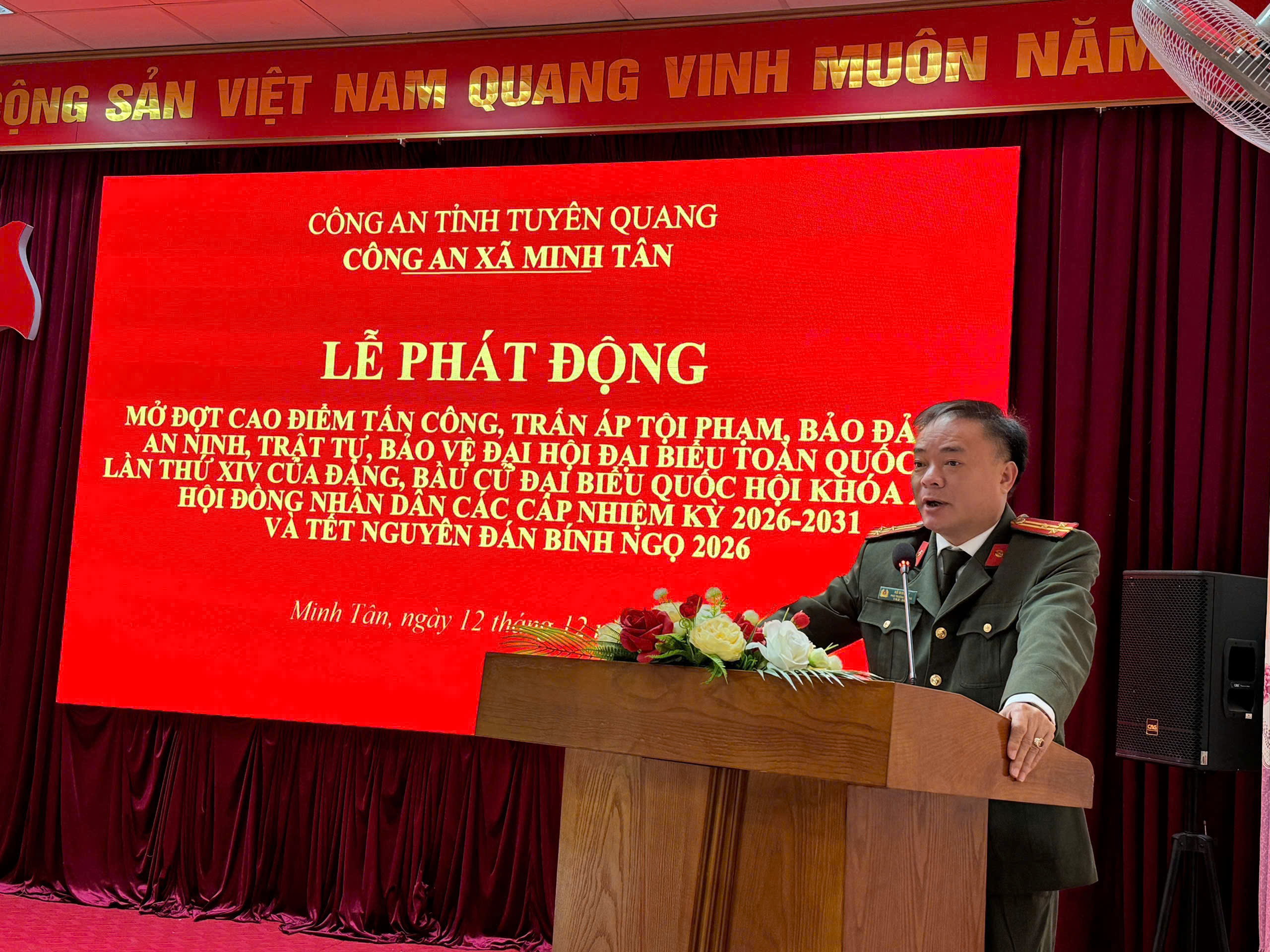 Thực hiện mệnh lệnh của đồng chí Giám đốc Công an tỉnh về việc đồng loạt ra quân thực hiện cao điểm tấn công, trấn áp tội phạm, đồng chí Thượng tá Hồ Minh Uy đã yêu cầu chỉ huy, cán bộ Công an xã Minh Tân triển khai đồng bộ, quyết liệt các biện pháp nghiệp vụ, nêu cao tinh thần trách nhiệm, tận tụy, chủ động hoàn thành tốt mọi nhiệm vụ được giao. Quyết tâm bảo vệ tuyệt đối, an toàn Đại hội đại biểu toàn quốc lần thứ XIV của Đảng, bầu cử đại biểu Quốc hội khóa XVI, Hội đồng nhân dân các cấp nhiệm kỳ 2026 - 2031 và tết Nguyên đán Bính Ngọ 2026. Tại buổi Lễ, đồng chí Vi Quang Ngọc, Phó Bí thư Đảng ủy, Chủ tịch UBND xã Minh Tân đã phát biểu ghi nhận những đóng góp trong công tác bảo đảm an ninh, trật tự của lực lượng Công an xã đồng thời tin tưởng rằng năm 2026 với nhiều sự kiện chính trị trọng đại của đất nước, địa phương diễn ra, lực lượng Công an xã sẽ hoàn thành xuất sắc nhiệm vụ bảo đảm an ninh, trật tự trên địa bàn. Với quyết tâm cao, ngay sau Lễ ra quân, lực lượng Công an xã, 14 Tổ an ninh trật tự trên địa bàn đã đồng loạt ra quân diễu hành trên các tuyến đường liên thôn, xã, chính thức ra quân thực hiện cao điểm tấn công, trấn áp tội phạm, bảo đảm an ninh trật tự trên địa bàn xã Minh Tân./.